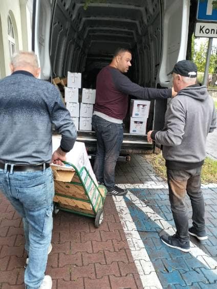 Wolontariusze pracują przy rozładunku towaru, będą również przygotowywać paczki żywnościowe dla osób korzystających z pomocy Związku.